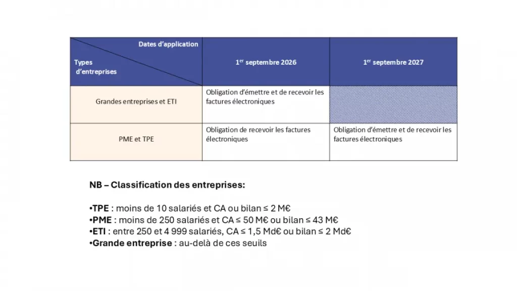 Le passage à la facturation électronique sera progressif, selon la taille de l’entreprise. Toutes devront être capables de recevoir des factures électroniques dès septembre 2026, mais l’obligation d’émission sera introduite progressivement :